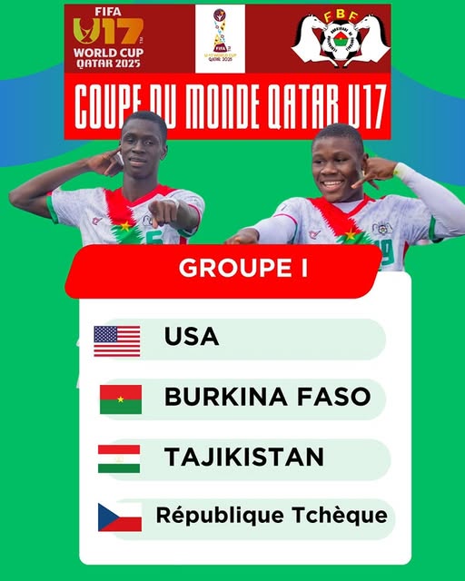 La FIFA a procédé, ce dimanche 25 mai, au tirage au sort de la prochaine Coupe du monde U17. 4ᵉ de la dernière CAN, le Burkina Faso a été tiré dans le groupe I en compagnie des États-Unis, du Tadjikistan et de la République tchèque. La compétition se déroulera du 3 au 27 novembre au Qatar et réunira un nombre record de 48 nations.